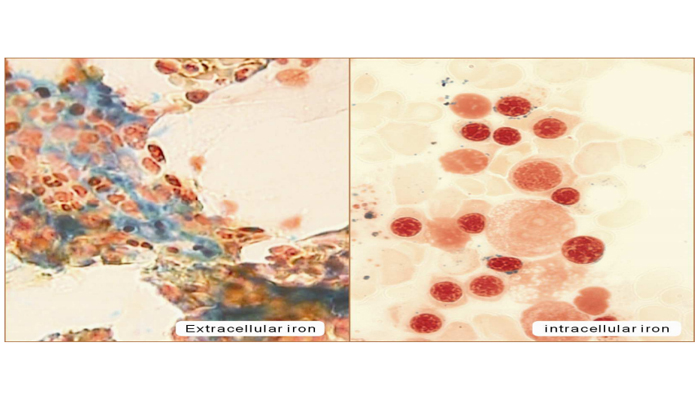Iron is stored in bone marrow as hemosiderin which makes nucleated erythrocytes to synthesize to hemoglobin. Iron stored outside of red blood cells is called extracellular iron. Iron granules are found in somepolychromatophilic normoblast, orthochromatic normoblast and mature red blood cells. Those cells are respectively called sideroblasts and siderocytes which belong tointracellular iron. This iron stain is based on the Prussian blue reaction. Acid potassium ferrocyanide reacts with intracellular iron and extracellular iron to form an insoluble blue ferric ferrocyanide
