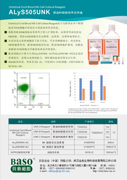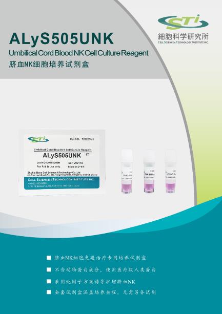 【產品概述】本試劑是為高效誘導人臍帶血NK 細胞而研發(fā),由UNK-A Reagent、UNK-B Reagent 和UNK-C Reagent 三支添加因子組成,含有優(yōu)質級細胞因子及醫(yī)療級重組蛋白,不含動物源成分,不含滋養(yǎng)層細胞,可高效誘導人臍帶血NK 細胞。本試劑需配套ALyS505NK-AC & EX 無血清培養(yǎng)基使用?商岣呒毎鲋潮稊怠K 細胞純度和殺瘤活性,同時使臍血NK 細胞培養(yǎng)操作標準化和簡易化。