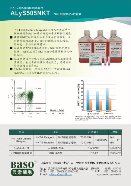 【產(chǎn)品概述】本試劑盒是專為NKT 細(xì)胞高效活化誘導(dǎo)而設(shè)計的新一代NKT 細(xì)胞培養(yǎng)試劑盒,由NKT-A Reagent、NKT-B Reagent 兩支試劑組成,含有優(yōu)質(zhì)級細(xì)胞因子及醫(yī)療級重組蛋白,不含動物源成分,不含滋養(yǎng)層細(xì)胞,可高效誘導(dǎo)人外周血PBMC 培養(yǎng)NKT 細(xì)胞。本試劑盒需配套ALyS505N-0 無血清培養(yǎng)基使用,可提高細(xì)胞增殖倍數(shù)、NKT 細(xì)胞純度和殺瘤活性,同時使NKT 細(xì)胞培養(yǎng)操作標(biāo)準(zhǔn)化和簡易化。